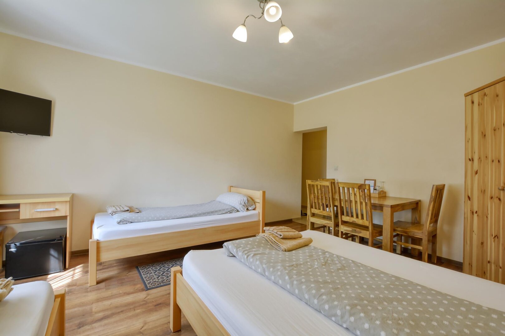 Nowy komfortowy i przestronny pokój 4 os z łazienką i prysznicem. Wygodne podwójne - niedzielone łóżko małżeńskie oraz dwa łóżka pojedyncze. Możliwość dostawki hotelowej 1 os w cenie 50zł/doba TV / WIFI / Komplet ręczników / suszarka hotelowa/ lodówka hotelowa w pokoju.